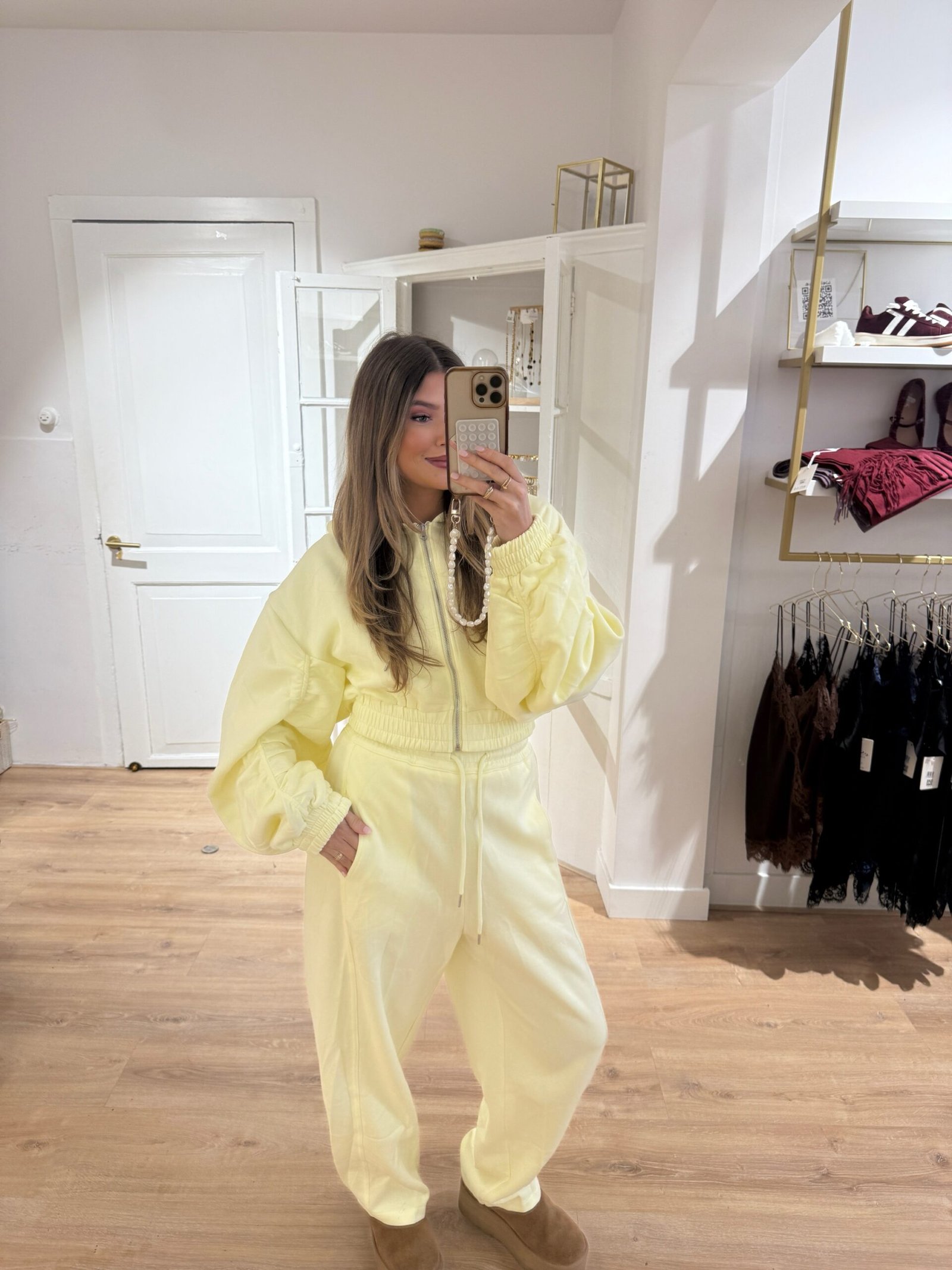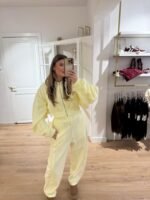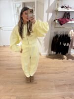 Dit heerlijke pak, verkopen wij in 3 kleuren! Geel, Licht roze & Grijs. Hij is lekker zacht en het model is perfect van dit pak, het heeft een balloon fit van de broek en valt oversized en ook het vestje valt oversized, maar is wel een cropped model.