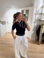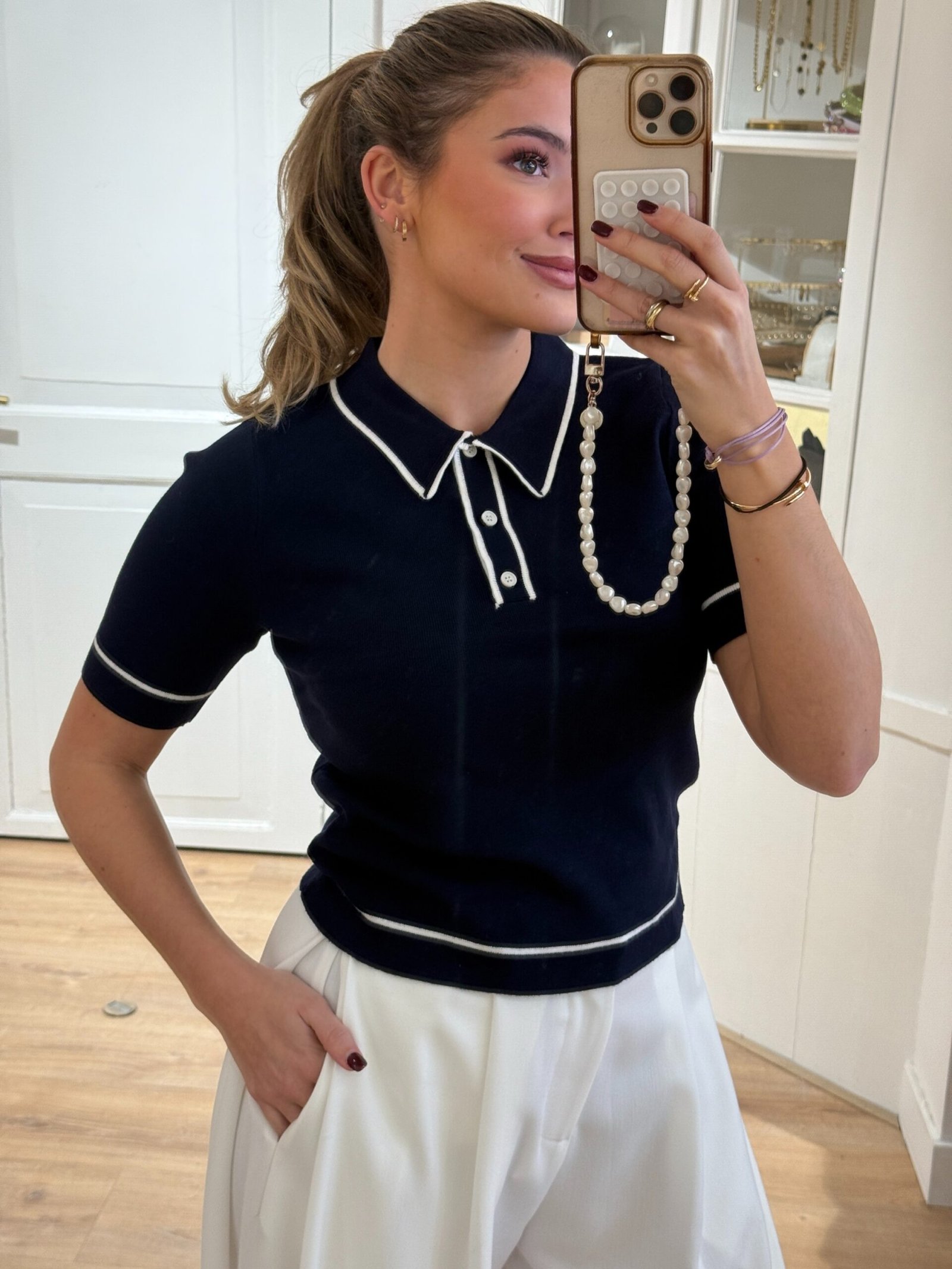 Een mooie polo, in het donkerblauw! Super leuk op onze poppy pantalon wit. Maar ook leuk op onze balloon jeans!