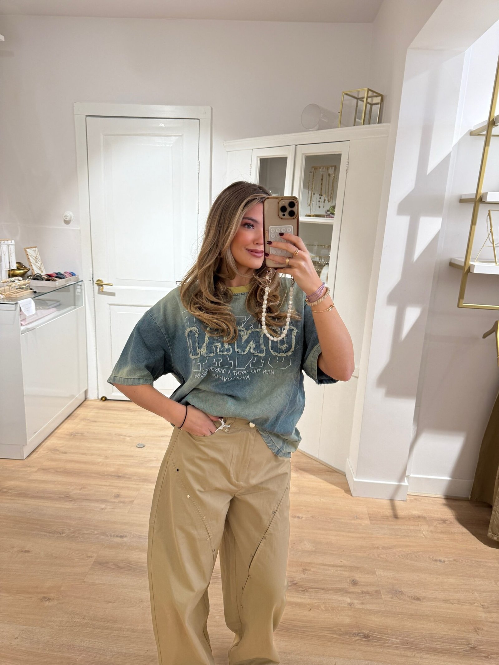 Dit stoerdere shirt, valt mooi oversized en heeft een super mooie wassing! Leuk voor dagelijks of een festival.
