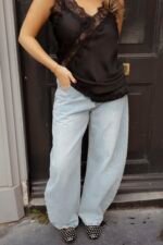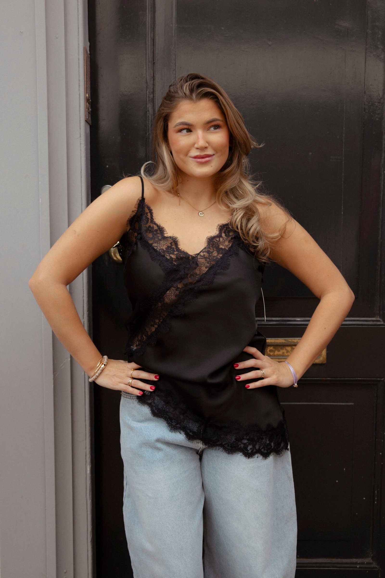 – Zwart , met kant aan de onderkant, schuin afgesneden.