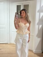 Verliefd verliefd verliefd, zijn we op deze topjes! Hoe leuk zijn ze? In het roze en geel verkrijgbaar. Leuk op een jeans of zoals wij het hebben op onze witte balloon broek