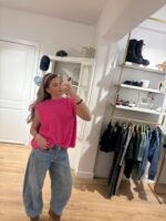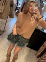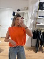 Simpel, maar leuk! En daar houden we van. Het is een oversized truitje met mouwloze armen waarbij het lijkt dat het schoudervulling heeft.