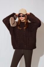 De bruine kabeltrui! Je kan hem oneindig stylen.